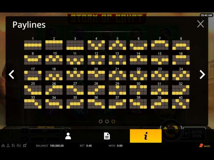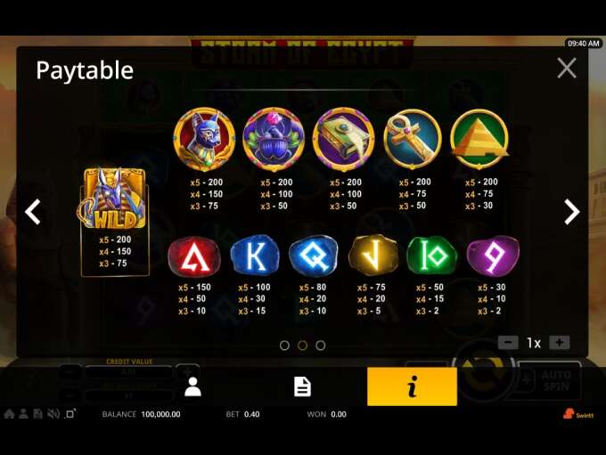 Storm Of Egypt is 5 reels 3rows online video slot offering 40 ways of winning, and when wagering requirements are concerned, you should know that the minimum bet starts at 0,40 and goes up to 100 coins per spin.