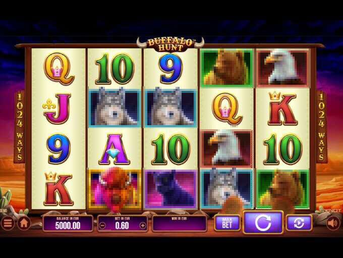 Buffalo Hunt is a highly - volatile 5 reels 4 rows online video slot with 1024 ways to win, where betting ranges span from 0,2 to 40 coins per spin.