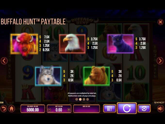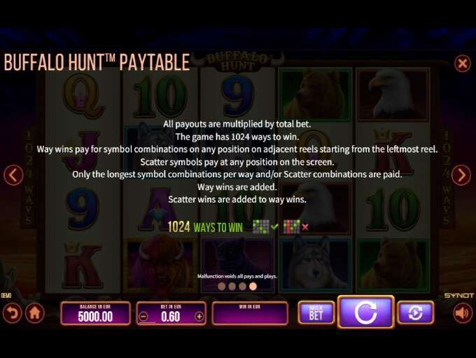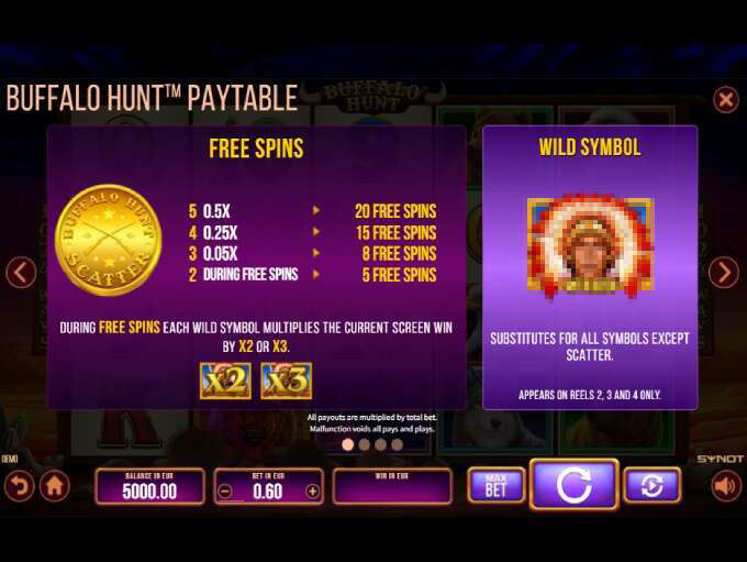 Buffalo Hunt by SYNOT Games is an action packed online game providing you with some popular features like free spins, wild multipliers, bonus gamble game and a decent RTP value.