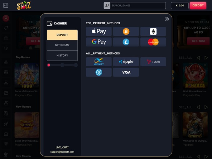 TheSlotz Casino offers a secure and straightforward banking system designed to make deposits and withdrawals easy for every type of player. The platform supports a mix of traditional payment methods, modern fintech options, and leading cryptocurrencies, ensuring flexibility across different preferences.