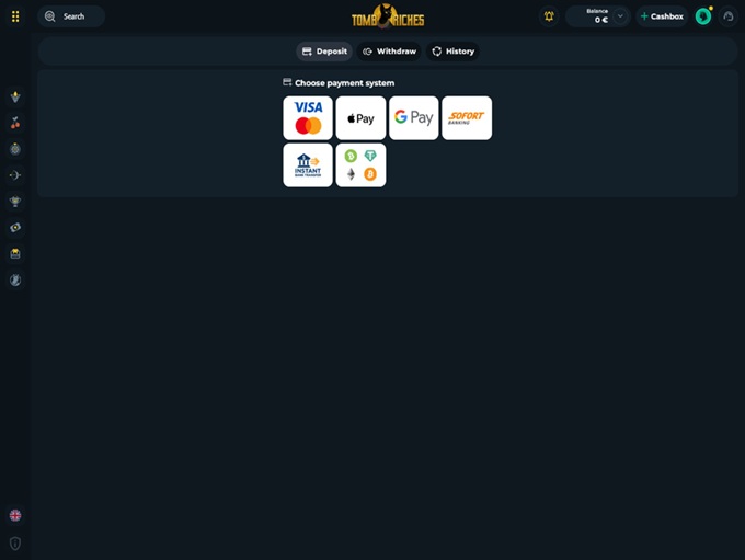 TombRiches Casino offers a diverse range of deposit options to facilitate smooth transactions. From trusted classics like Visa and Mastercard to convenient digital wallets such as Skrill and Neteller, players have ample ways to fund their accounts effortlessly.