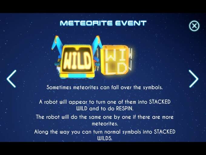 Robot can also replace any normal symbol into a stacked wild and will continue to do so until there are no more meteorites left making the robot leave and the game will continue as usual.