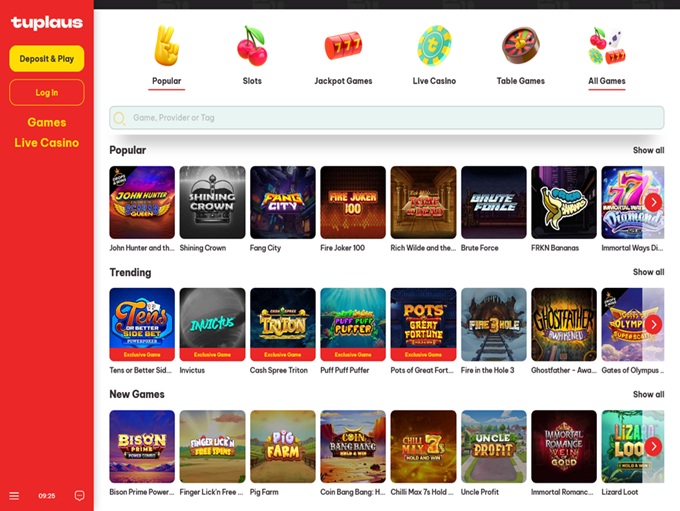 When it comes to design and usability, Tuplaus runs on a bold, energetic visual style that feels playful and full of life. Red, white, and yellow dominate the design, clearly aiming at the traditional slot machine atmosphere. The homepage wastes no time showing its strongest asset – a large banner filled with Tuplaus branding. At the same time, the flashing yellow ‘Deposit & Play’ button pulls attention, but without being overdone.