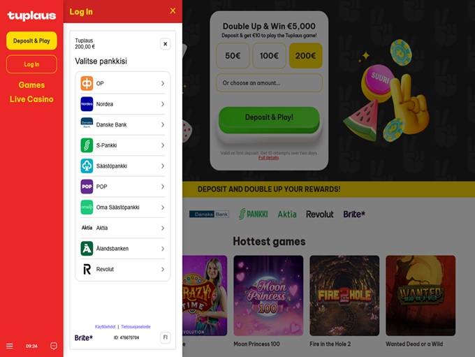 Getting started at Tuplaus is refreshingly easy! Players choose their deposit amount on the homepage, select their bank, and confirm the payment through online banking. Once that’s done, the games are ready to go. A piece of cake. The whole process takes moments and keeps the focus where it belongs – on playing, not paperwork!