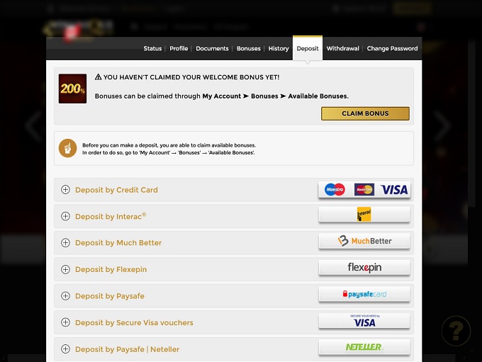 You'll need to log into your account to see the specific banking options available to players in your region. Generally, Visa, Mastercard, Neteller, Skrill, Paysafecard, and iDeal are accepted deposit methods.