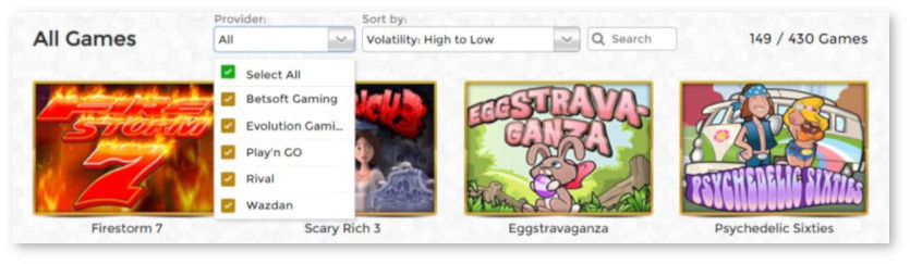 - Sort by popularity: high to low, most recent, alphabetical, payout high to low or low to high, or volatility high to low or low to high