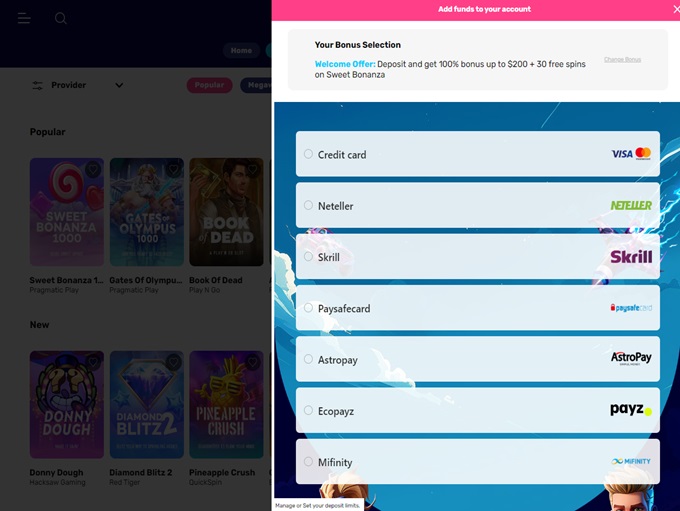 Payment availability may vary depending on your country, so it’s best to check your account and the cashier section after registration for a detailed list of options tailored to your location. Minimum deposit requirements also differ by region but are generally low. This information will appear in the cashier as well, providing specific deposit details based on your country.