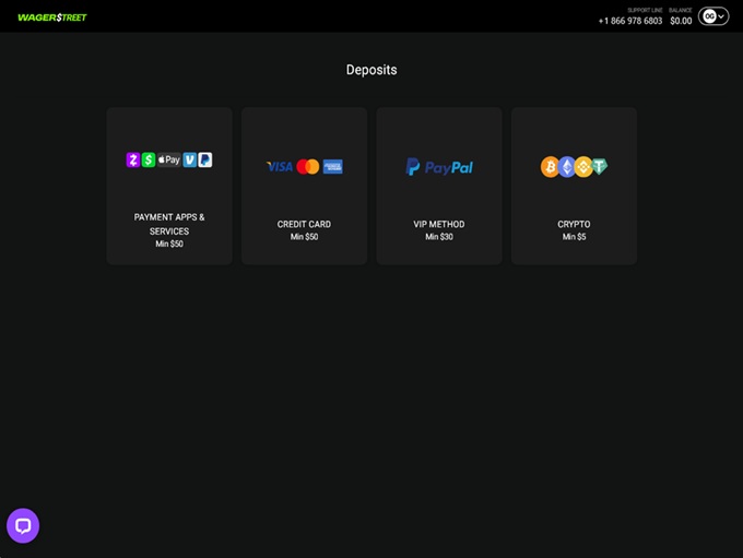 Wager Street Casino covers the basics when it comes to online casino payments. Players can choose between traditional banking methods and a strong mix of cryptocurrencies. The setup feels built for both card users and crypto gamblers who prefer digital wallets over banks.