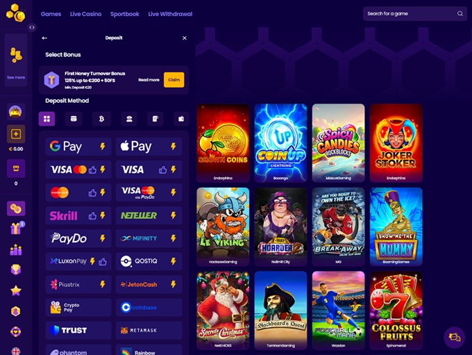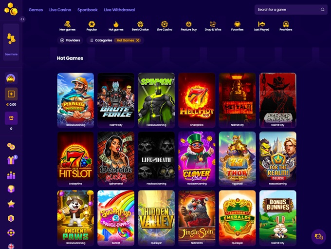 The site’s color scheme? Purple and yellow, of course. It's all about that buzzing, honey-dipped aesthetic. The whole look feels fun without being over-the-top-like a cartoon that grew up just enough to be taken seriously. Everything is where you'd expect it to be: game categories at the top, promos on the left in a slide-out tab (you can hide it if you want), and all the „serious“ links like Terms and Conditions and Responsible Gaming neatly tucked into the footer. Tucked, yes, but not forgotten! Be sure to read it carefully!