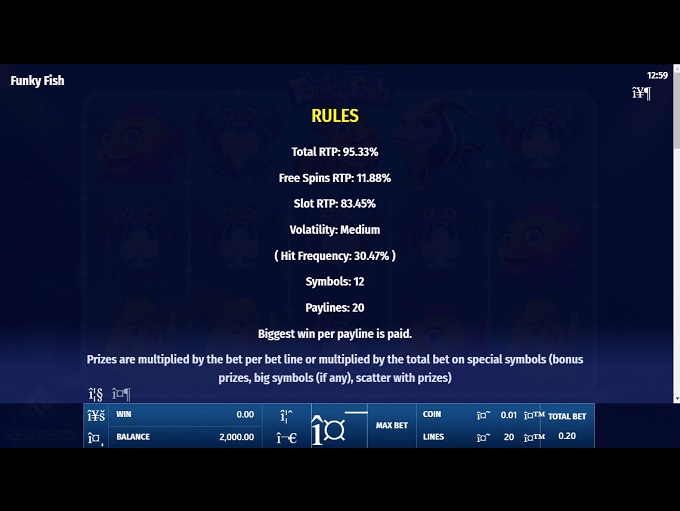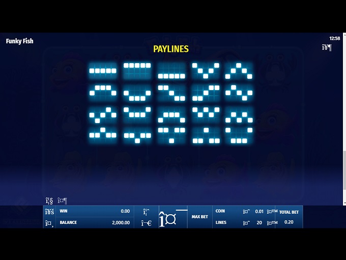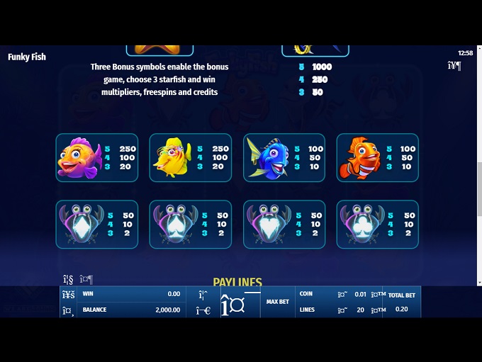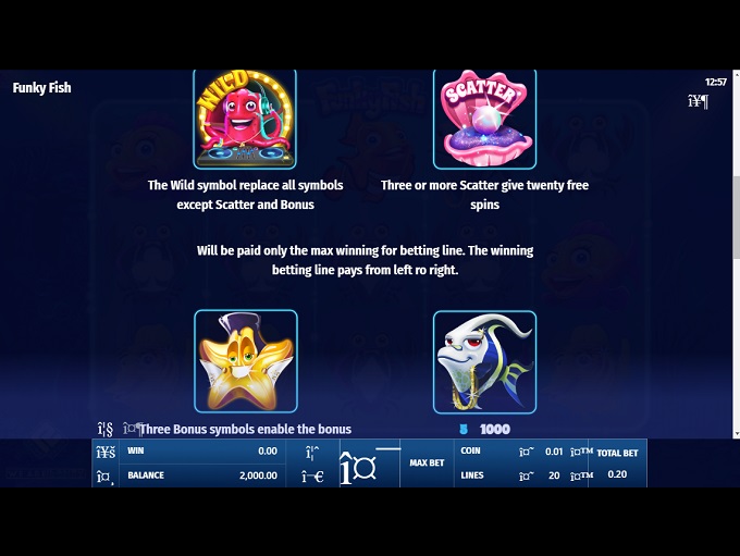 Funky Fish online video slot features five reels and three rows with up to 20 paylines crossed over the reels. All symbols, except Scatter and Bonus ones, create winning combinations landing from left to right on an active payline.