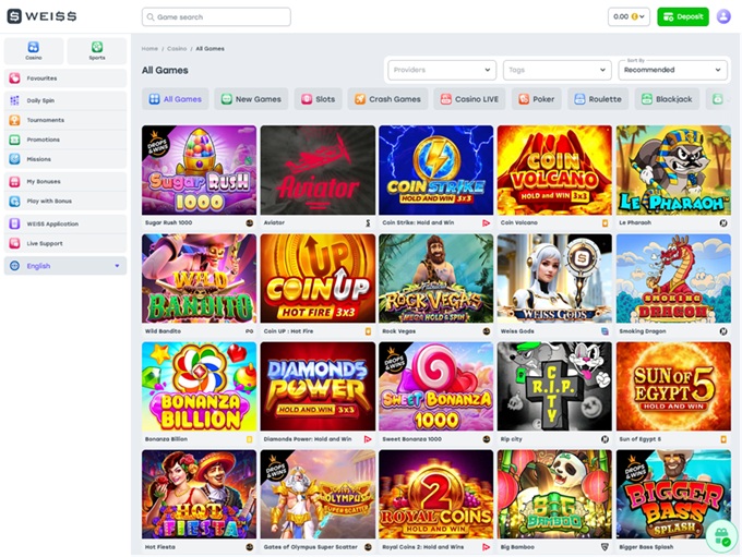 Weiss Casino offers an extensive selection of games, appealing to a broad range of players. With several thousand games available, the casino provides a rich variety of options, catering to different preferences and gaming styles. The game count is one of its standout features, although this number is subject to change as new games are regularly added.