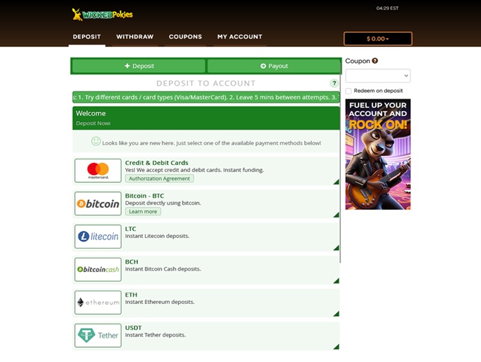 Wicked Pokies supports a solid mix of payment options, catering to both crypto fans and those who prefer traditional banking methods. Deposits are quick and seamless, with funds landing in your account almost instantly, ideal for players who want to jump straight into the action! Whether you’re using a major credit card or a popular cryptocurrency, topping up your balance is straightforward and flexible.