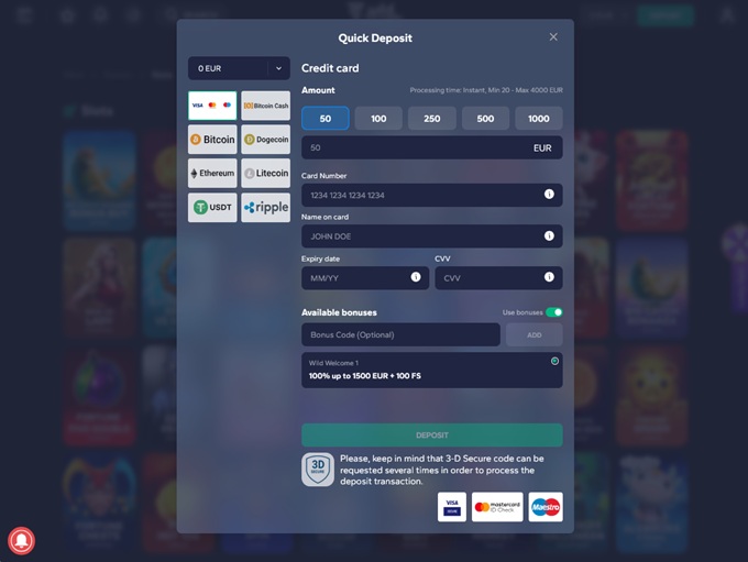 Multiple currencies as well as virtual currencies like Bitcoin and Ethereum are supported. The site is 100% secure using SSL-encryption.