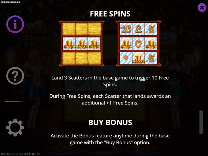 Buy Bonus - Any time, players can pay the price and buy free spins: 50x the total bet for five free spins, 100x the total bet for ten, and 200x the total bet for 20 free rounds.