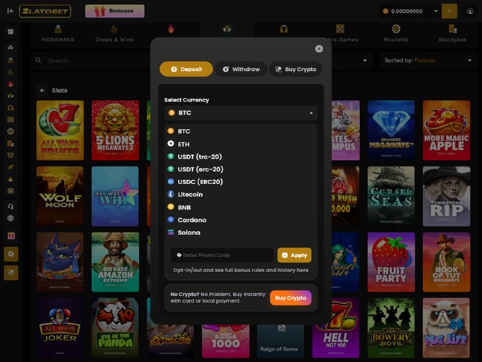 As a forward-thinking crypto gaming platform, ZlatoBet offers a modern and secure approach to online payments. Players can choose from a range of trusted cryptocurrencies, including Bitcoin, Ethereum, Litecoin, Dogecoin, Tether, and many others. These digital currencies are recognized worldwide for their reliability, speed, and accessibility, making deposits and withdrawals both simple and efficient.