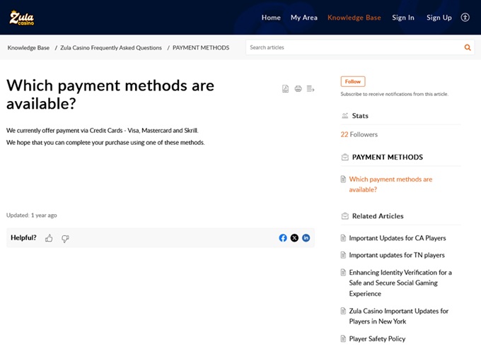 Payments can be made using a few standard methods, including Visa, Mastercard, and Skrill. While the current list isn’t the longest you’ll find, these are widely used and should cover the needs of most players. And since Zula is still relatively fresh, more payment options will likely be added in the future.